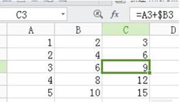 如圖,我們?nèi)匀蛔尩谝涣?第二列,此時(shí)我們輸入公式:“=A1+$B1”,此時(shí)我們保證了列是不變的,之后的操作一樣,如果我們輸入公式為:“=A1+B$1”,那么我們就保證了行不變的。