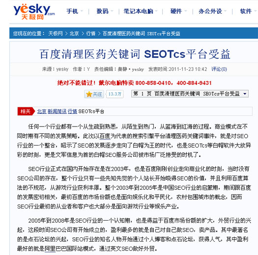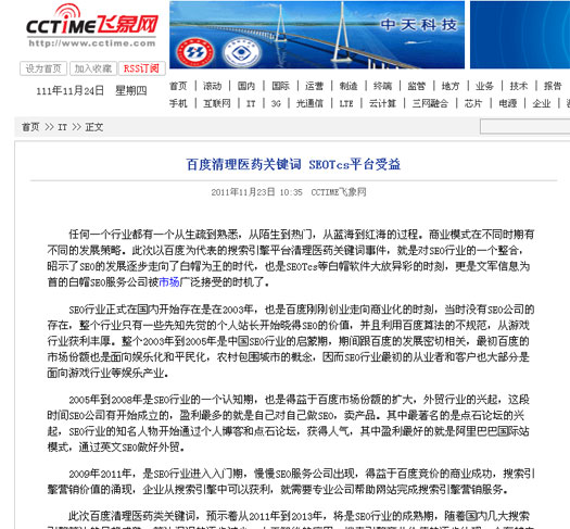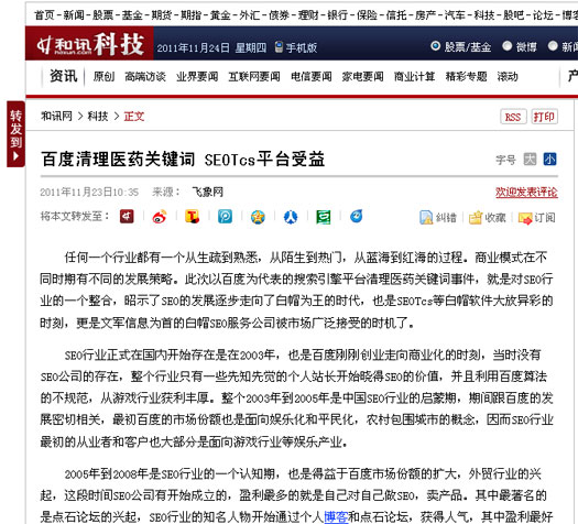 搜狐報道:百度清理醫藥關鍵詞 SEOTcs平臺受益