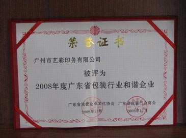 廣州藝彩印務被評為:2008年度廣東省包裝行業和諧企業 廣東省包裝行業和諧企業 榮譽證書